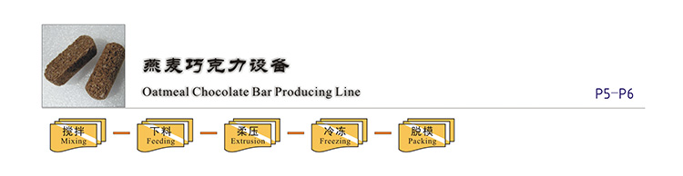 Oatmeal chocolate from mixing, blanking, forming, freezing, demoulding automatically, the machine is only 6.5 meters in length, artificial only 1 person, can complete the production 3 tons / 8 hours, a variety of casual die change modelling, and only 20 minutes to replace