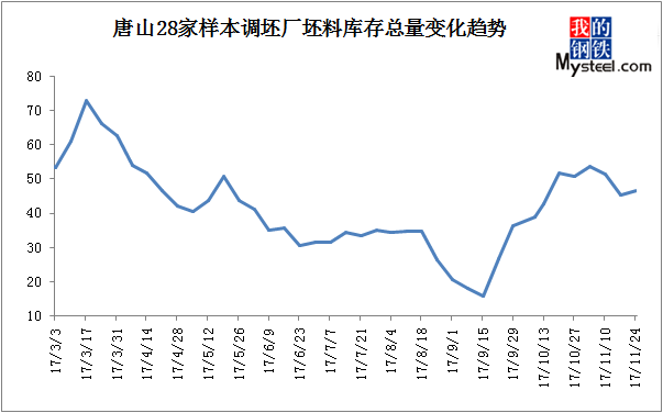 截止至11月26日,钢城唐山采暖季高炉执行限产进入第二周。在上游供应端资源持续收紧以及需求方采购意愿偏低的现状下,钢坯主流价格由上周五的3780元/吨小幅攀升至3830元/吨,居高不下的价格在供需两弱的市场中小幅走高。
